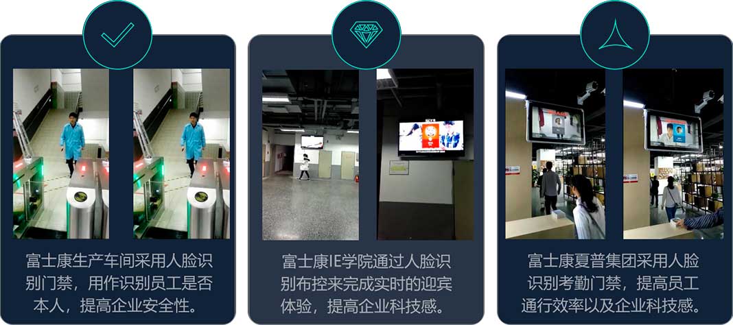 現(xiàn)已跟富士康B次集團(tuán)、FG次集團(tuán)、F次集團(tuán)、IE學(xué)院、夏普等富士康機(jī)構(gòu)開始合作,代替?zhèn)鹘y(tǒng)的上班指紋打卡,通過刷臉進(jìn)行開門交互,訪客到訪之后的貴賓提醒,增加了企業(yè)的科技感。
