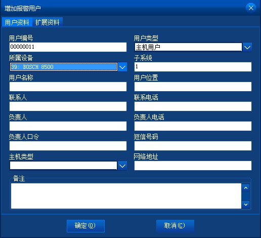 可錄入報(bào)警用戶的聯(lián)系信息和主機(jī)類型及用戶備注。