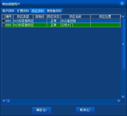 修改報(bào)警用戶時(shí),顯示防區(qū)資料選項(xiàng)頁(yè)。如下圖: