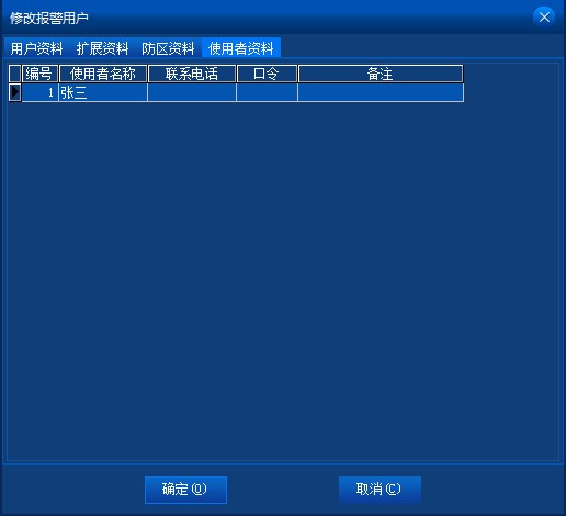 當(dāng)修改報(bào)警用戶時(shí),還會(huì)有防區(qū)資料和使用者資料錄入。