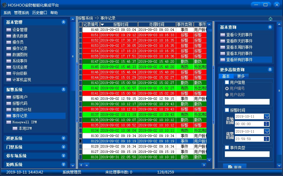 在平臺(tái)軟件中操作面板里的報(bào)警系統(tǒng)面板組上,點(diǎn)擊【事件記錄】,功能區(qū)將顯示報(bào)警事件記錄數(shù)據(jù)網(wǎng)格,如下圖: