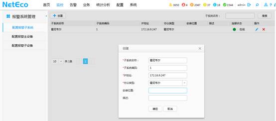 登錄NetEco,進(jìn)入【監(jiān)控?報(bào)警系統(tǒng)?配置報(bào)警子系統(tǒng)】頁(yè)面,點(diǎn)擊【創(chuàng)建】按鈕,填寫相關(guān)信息。子系統(tǒng)名稱可以自行命名,子系統(tǒng)編碼對(duì)應(yīng)第1步中報(bào)警系統(tǒng)的設(shè)備編碼,IP地址為報(bào)警系統(tǒng)軟件所在服務(wù)器的IP地址,協(xié)議類型選擇霍尼韋爾。