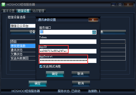 1、設(shè)置短信服務(wù)器的通訊參數(shù),APPID和APPSecret填與公眾號(hào)相對(duì)應(yīng)的: