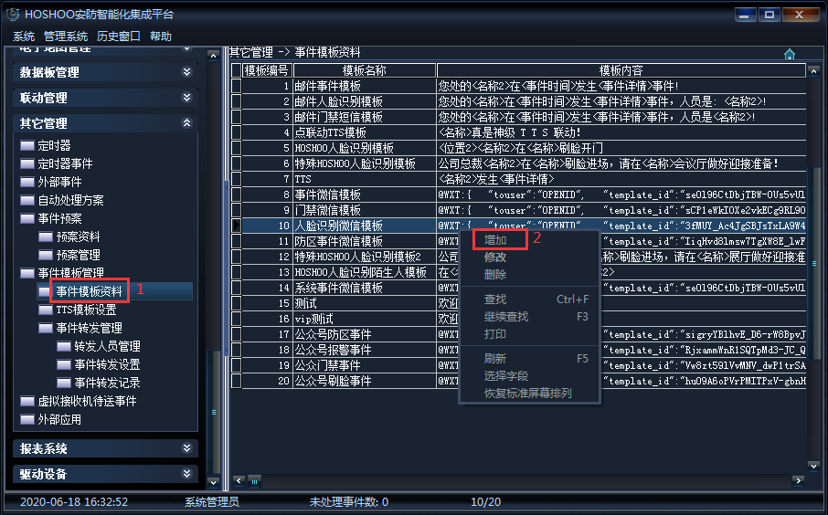 《其它管理》→《事件模板資料》→《事件模板資料》→右鍵菜單《增加》,如下圖所示: