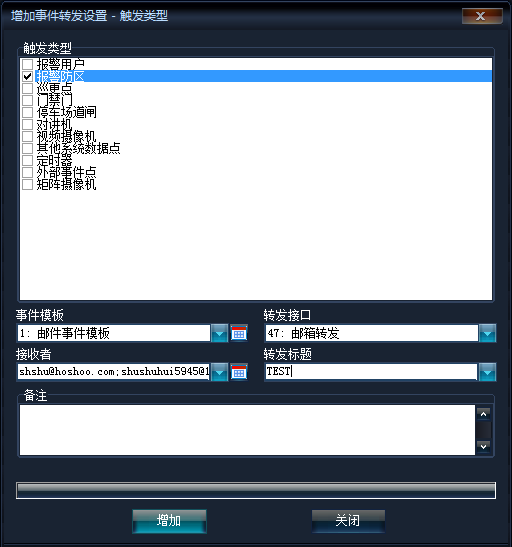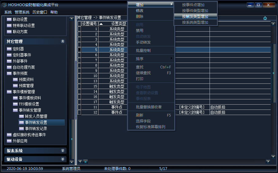 《其它管理》→《事件管理模板》→《事件轉(zhuǎn)發(fā)設(shè)置》→右鍵菜單《增加》→《按觸發(fā)類型增加》,如下圖所示(以按觸發(fā)類型增加為例):