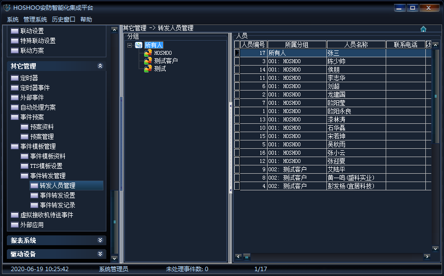 《其它管理》→《事件模板管理》→《事件轉(zhuǎn)發(fā)管理》→《轉(zhuǎn)發(fā)人員管理》,查看所有的分組和人員,如下圖所示: