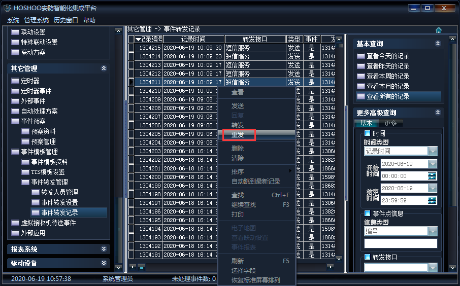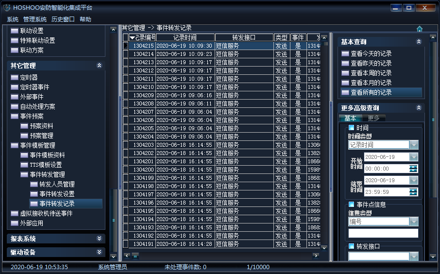 《其它管理》→《事件模板管理》→《事件轉(zhuǎn)發(fā)管理》→《事件轉(zhuǎn)發(fā)記錄》;查看所有的轉(zhuǎn)發(fā)記錄,如下圖所示: