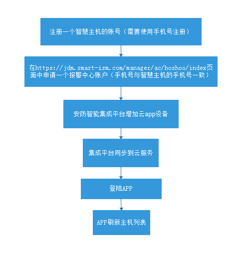 3. 從https://jdm.smart-ism.com/manager/ac/hoshoo/index頁面中申請一個(gè)報(bào)警中心賬戶(注意:手機(jī)號需要與智慧主機(jī)的手機(jī)號一致);賬戶信息如下圖: