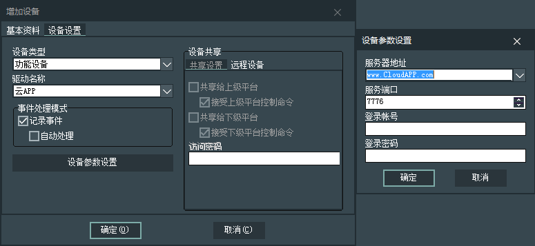 4. 在安防智能化集成平臺端中的基本管理→設(shè)備管理中添加一個(gè)設(shè)備類型是功能設(shè)備,設(shè)備名稱為云APP的設(shè)備信息(其中設(shè)備參數(shù)設(shè)置中的登錄賬號和登錄密碼通過上面的第3條申請獲?。?。