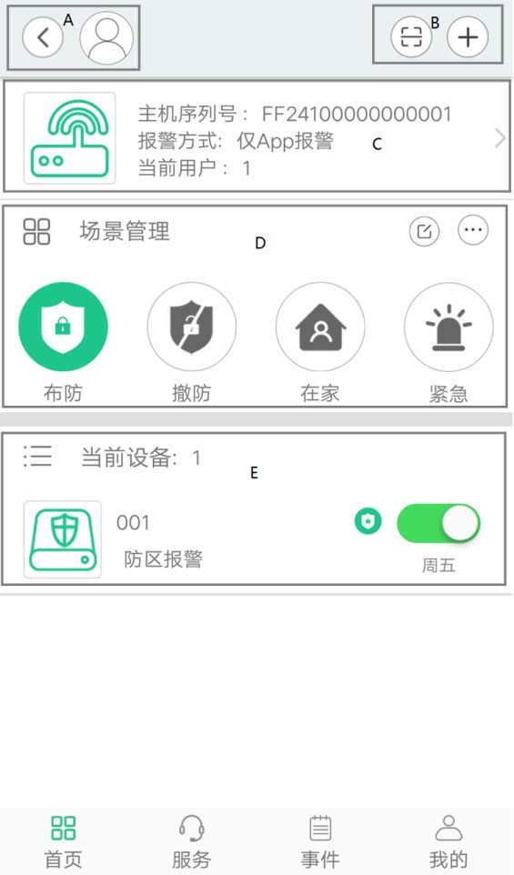 2. 在APP端主頁點(diǎn)擊一個(gè)主機(jī),顯示效果如下圖,其中A部是返回鍵和查看用戶信息;區(qū)是可以通過掃一掃掃描主機(jī)和設(shè)備的二維碼使用旁邊的加號可以添加主機(jī)、設(shè)備等信息;C區(qū)可以查看當(dāng)前主機(jī)的相關(guān)信息;D區(qū)可以進(jìn)行對主機(jī)的事件進(jìn)行管理,如點(diǎn)擊撤防按鈕會在安防智能化集成平臺端和APP端各自產(chǎn)生一條數(shù)據(jù);E區(qū)點(diǎn)擊當(dāng)前事件可以查看當(dāng)前主機(jī)的所有狀態(tài)。
