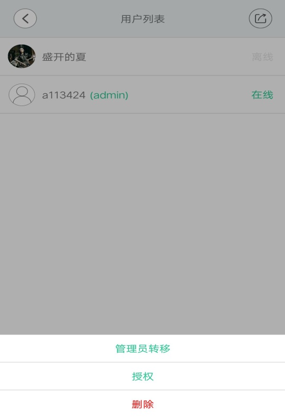 管理員轉(zhuǎn)移:是將admin的權(quán)限給當(dāng)前所點(diǎn)擊用戶,使當(dāng)前點(diǎn)擊用戶為其設(shè)備的的管理員,可以使用二維碼添加二級用戶。