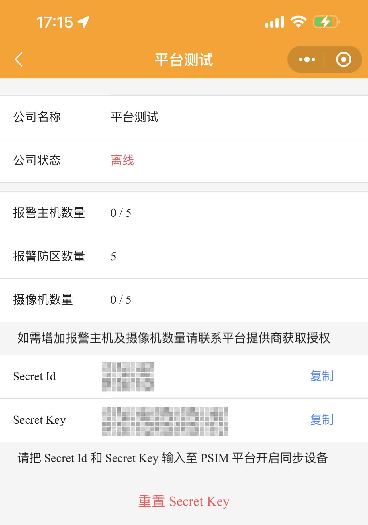 3、初次使用無(wú)任何設(shè)備,需在【我的】→【關(guān)聯(lián)PSIM平臺(tái)】申請(qǐng)綁定,綁定后將隨機(jī)獲得登錄賬號(hào)(Secret ID)和登錄密碼(Secret Key)。在PC端集成平臺(tái)軟件中設(shè)置2個(gè)設(shè)備完成和PSIM平臺(tái)助手通訊。