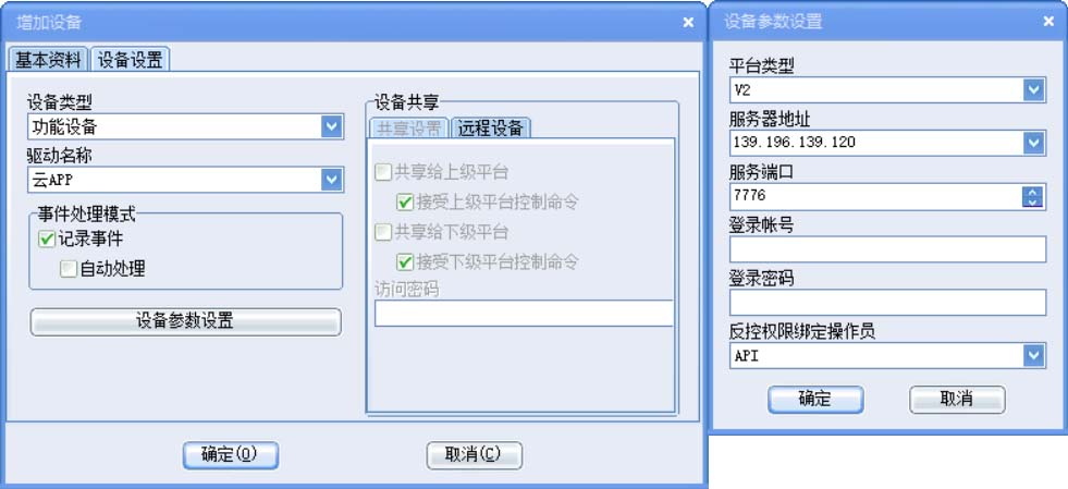 設(shè)備類型:功能設(shè)備,設(shè)備名稱:云APP,點(diǎn)擊【設(shè)備參數(shù)設(shè)置】