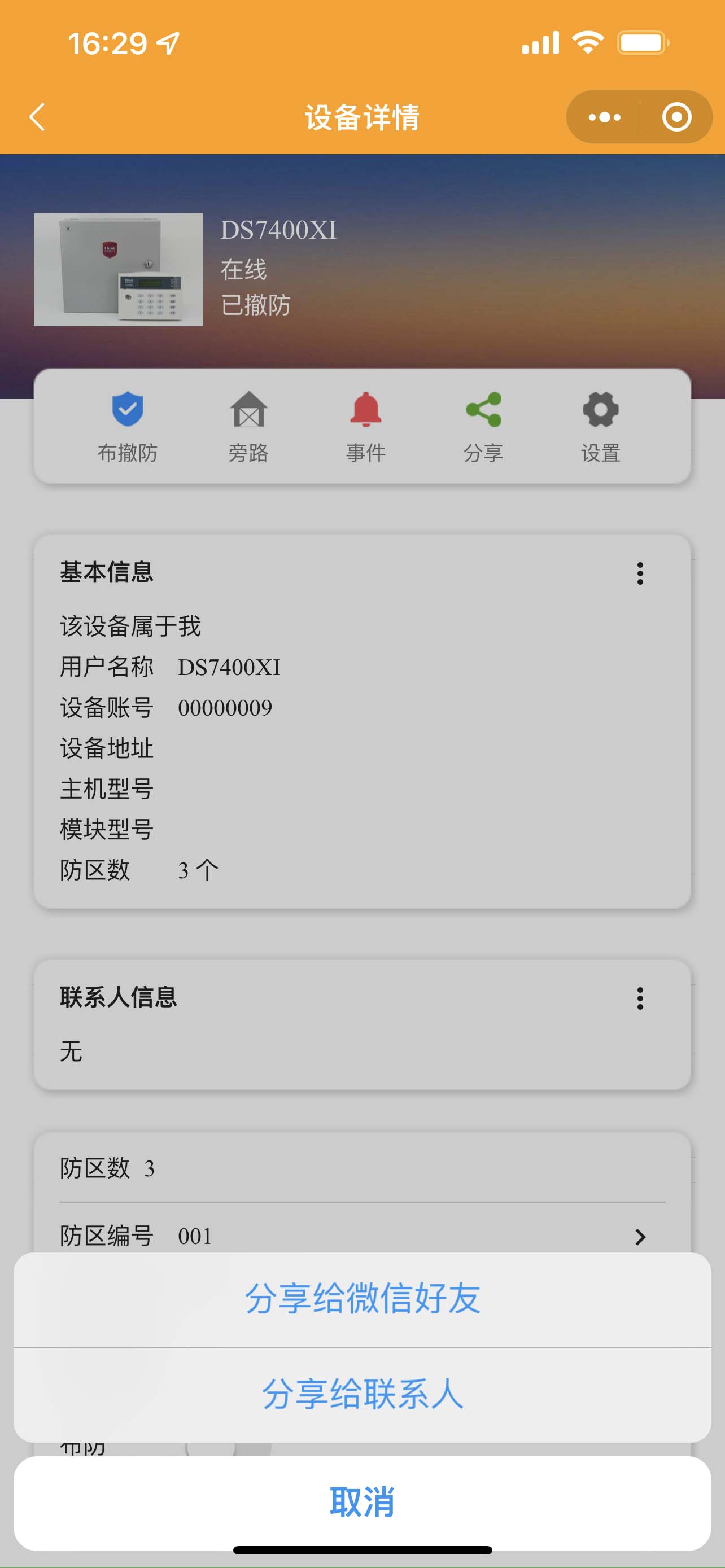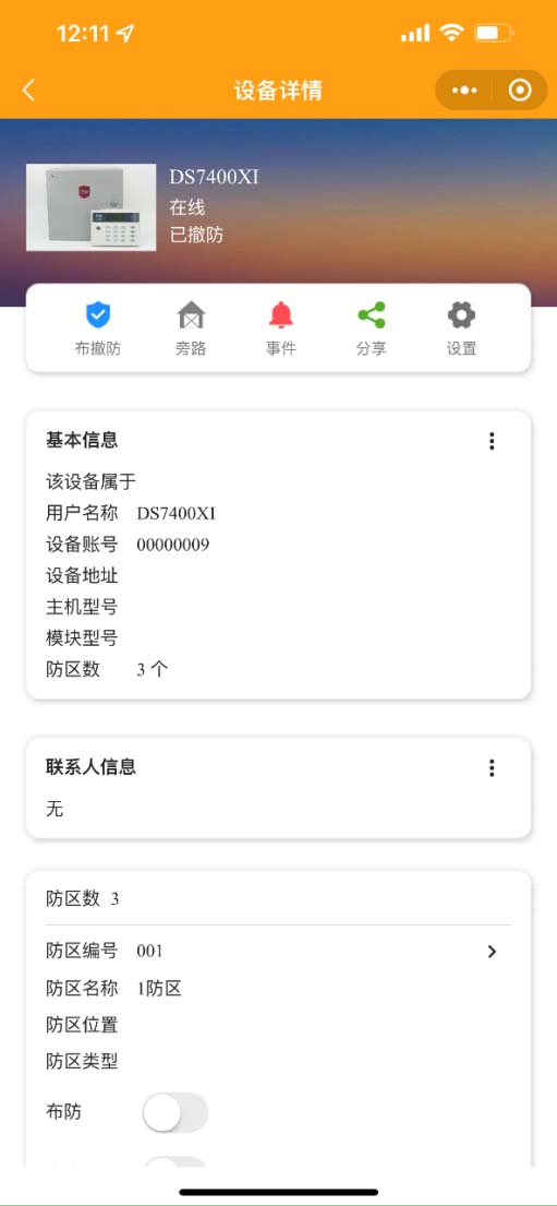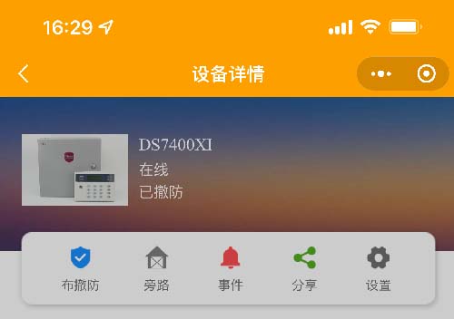 中部是快捷按鈕可以布撤防主機(jī),旁路防區(qū)、查看事件、分享設(shè)備、設(shè)置等;