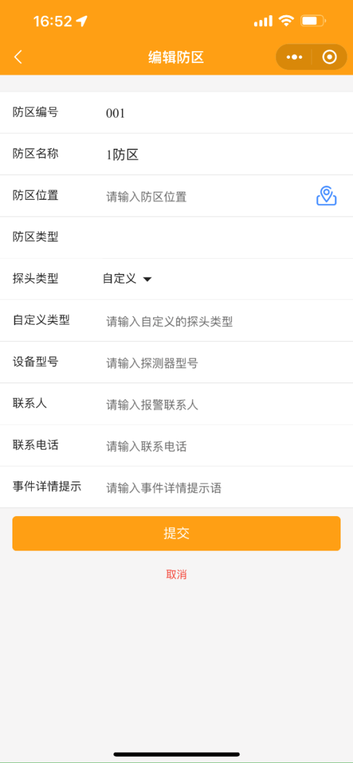 2.3 設(shè)置防區(qū)信息:可編輯防區(qū)位置、探頭類型、自定義類型、設(shè)備型號(hào)、聯(lián)系人、聯(lián)系電話、事件詳情提示。點(diǎn)擊防區(qū)位置右側(cè)圖標(biāo)可設(shè)置防區(qū)定位。防區(qū)編號(hào)、防區(qū)名稱、防區(qū)類型需通過(guò)PC端集成平臺(tái)修改后同步。