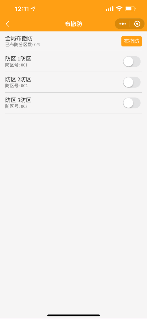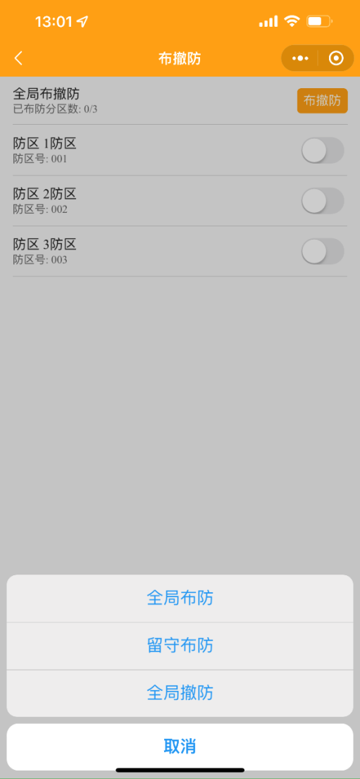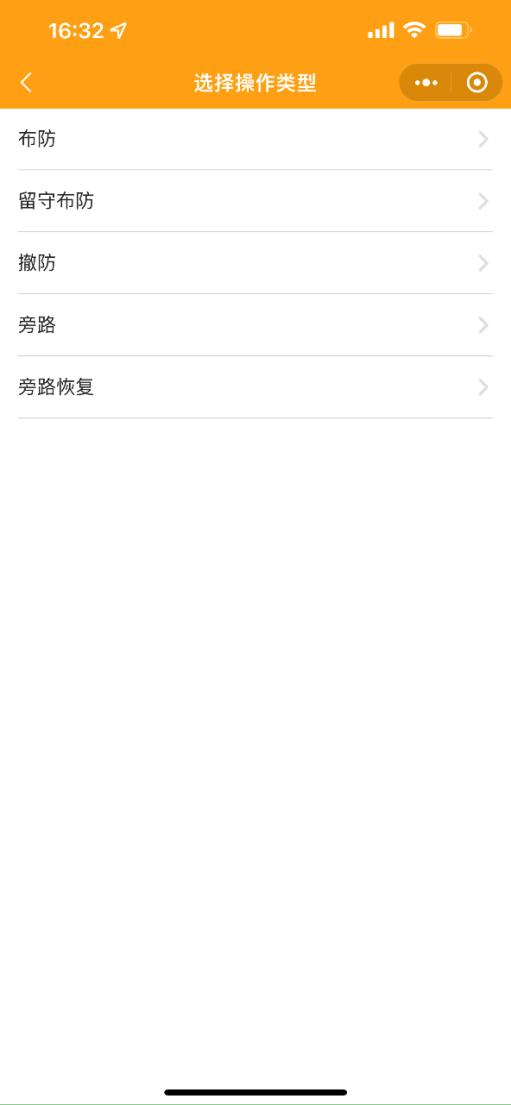 3. 手機(jī)小程序上控制安防智能化集成平臺(tái)的報(bào)警系統(tǒng)布防、撤防、旁路等功能;