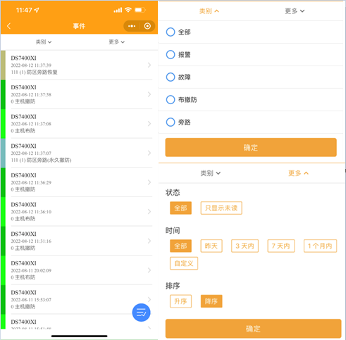 2.7 查詢事件:點(diǎn)擊事件按鈕進(jìn)入事件界面,點(diǎn)擊類別和更多可按警情和時(shí)間分類查詢事件。點(diǎn)擊藍(lán)色按鈕把事件全部標(biāo)記為已讀。