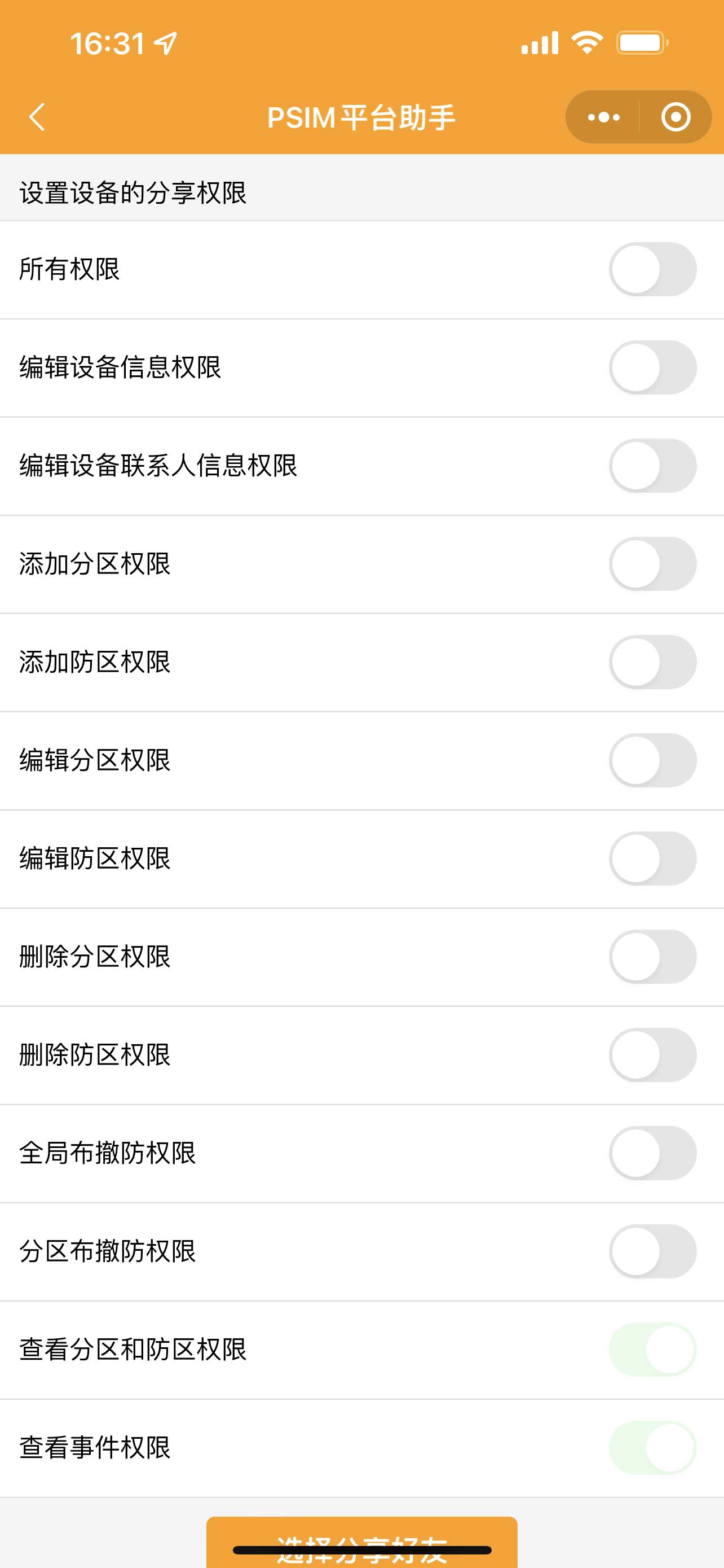 3. 選擇好友的權(quán)限,默認(rèn)只有查看分和防區(qū),查看事件權(quán)限。需要其他權(quán)限右劃打開。