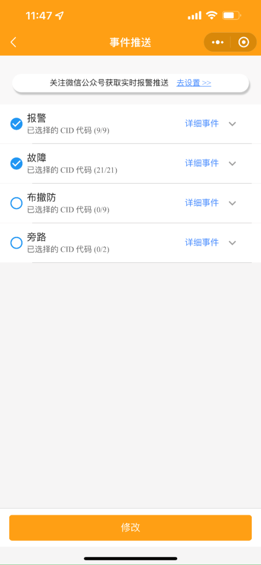 1.1 修改事件推送:勾選需要推送的事件類型,點(diǎn)擊修改確認(rèn)。點(diǎn)擊【去設(shè)置】關(guān)注微信公眾號(hào)“5G智聯(lián)運(yùn)維助手”,獲取設(shè)備報(bào)警推送信息。