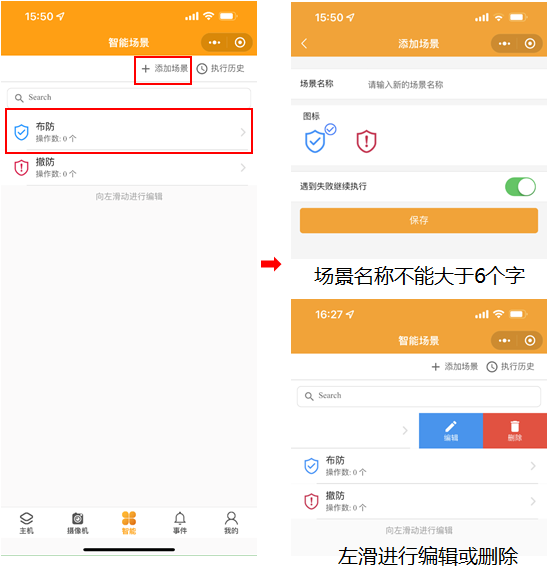 1.5 智能場(chǎng)景:智能界面設(shè)置快捷方式,點(diǎn)擊【添加場(chǎng)景】輸入場(chǎng)景名稱選擇圖標(biāo)添加操作按鈕。點(diǎn)擊布防場(chǎng)景圖標(biāo),進(jìn)行添加操作。