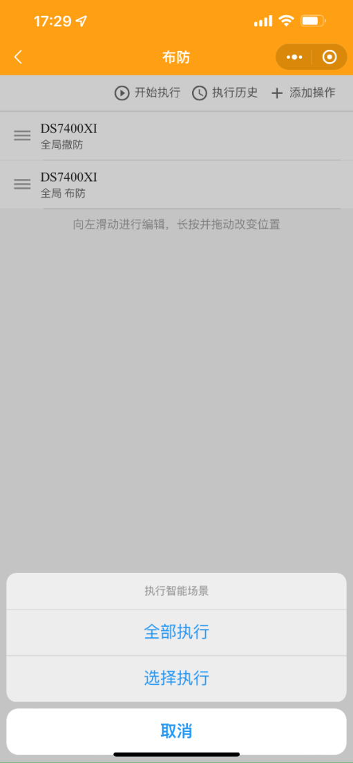 進(jìn)入布防場(chǎng)景后點(diǎn)擊添加操作,選擇設(shè)備。單個(gè)場(chǎng)景可添加多個(gè)操作(多個(gè)命令和設(shè)備),重復(fù)添加操作步驟即可。
