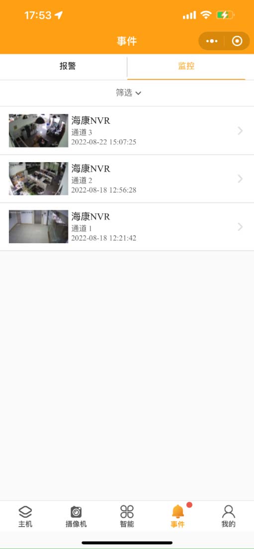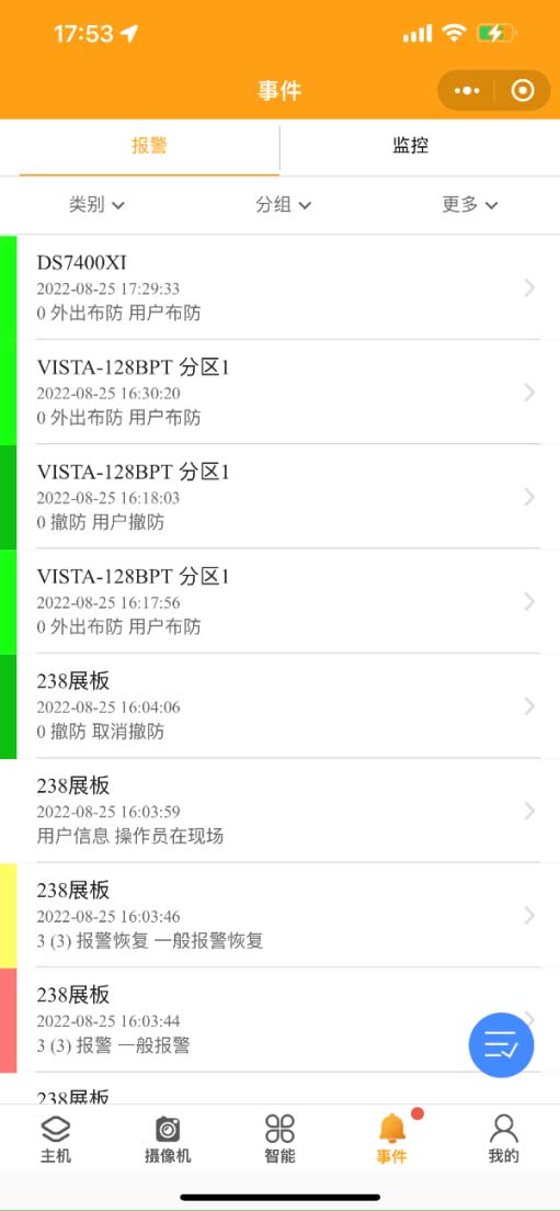 2. 事件:事件界面分為報(bào)警和監(jiān)控??砂搭悇e、分組、更多等方式查詢報(bào)警事件。