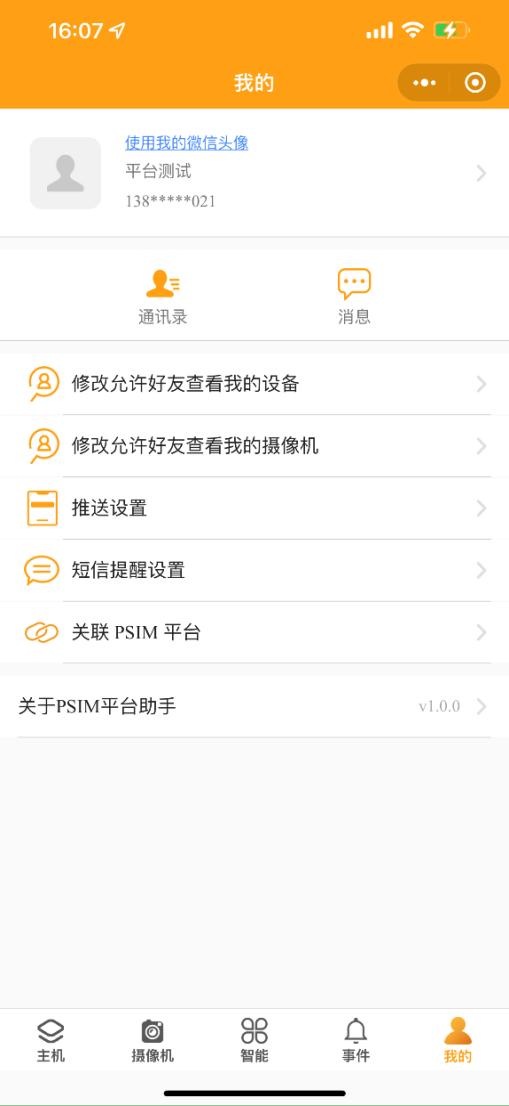3. 我的:修改允許好友搜索我的設(shè)備、修改允許好友查看我的攝像機(jī)、推送設(shè)置、短信提醒設(shè)置、關(guān)聯(lián)PSIM平臺(tái)這幾項(xiàng)功能和設(shè)備詳情里的設(shè)置方式相同。點(diǎn)擊頭像可更改頭像、昵稱、修改密碼等。
