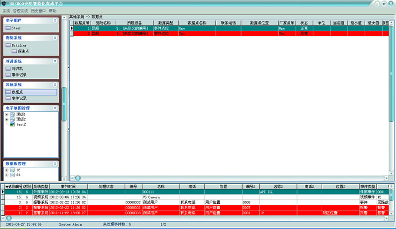 ● 多級(jí)電子地圖和數(shù)據(jù)板,更人性化的呈現(xiàn)數(shù)據(jù)點(diǎn)。豐富、靈活的地圖管理功能,可在地圖和數(shù)據(jù)板上直接控制數(shù)據(jù)點(diǎn)及其關(guān)聯(lián)系統(tǒng)??蓪⒌谌较到y(tǒng)的數(shù)據(jù)點(diǎn)放到平臺(tái)地圖上管理,解決第三方系統(tǒng)沒有電子地圖及地圖功能不靈活等情況。