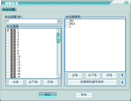 輪巡攝像機(jī):選擇用于做輪巡的攝像機(jī)。通過向上和向下按鈕可改變攝像機(jī)的輪巡順序。