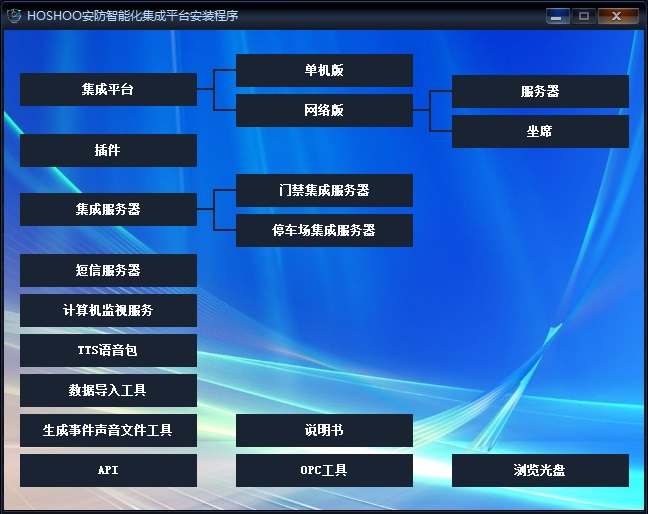 將安裝光盤(pán)放入光驅(qū)內(nèi),雙擊運(yùn)行光盤(pán)目錄下的Autorun.exe,將彈出HOSHOO安防智能化集成平臺(tái)安裝程序界面,彈出下圖: