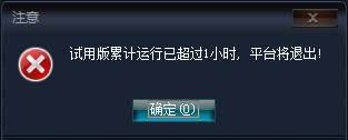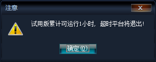 試用版平臺(tái),只允許連續(xù)運(yùn)行1個(gè)小時(shí),運(yùn)行1個(gè)小時(shí)后,將彈進(jìn)試用版超時(shí)提示框,如下圖: