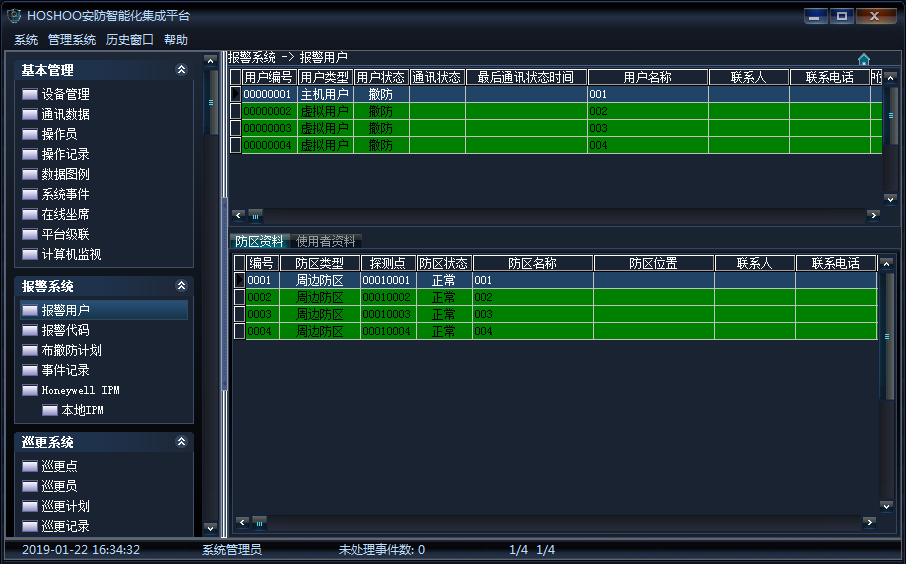在平臺(tái)軟件中操作面板里的報(bào)警系統(tǒng)面板組上,點(diǎn)擊【報(bào)警用戶】,功能區(qū)將顯示報(bào)警用戶數(shù)據(jù)網(wǎng)格,如下圖: