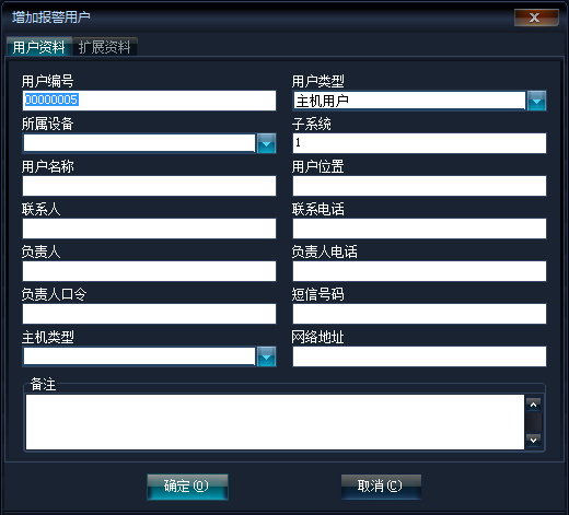 可錄入報(bào)警用戶的聯(lián)系信息和主機(jī)類(lèi)型及用戶備注。