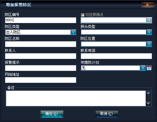 可錄入報(bào)警防區(qū)的聯(lián)系信息和探頭類(lèi)型及防區(qū)備注。