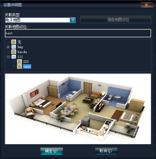 在電子地圖樹(shù)中選擇要關(guān)聯(lián)的詳細(xì)地圖;選擇無(wú),則為清除取消詳細(xì)圖關(guān)聯(lián)。