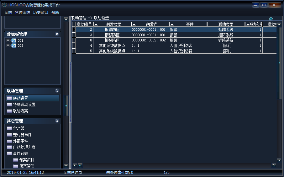 在平臺(tái)軟件中操作面板里的聯(lián)動(dòng)管理面板組上,點(diǎn)擊【聯(lián)動(dòng)設(shè)置】,功能區(qū)將顯示聯(lián)動(dòng)設(shè)置數(shù)據(jù)網(wǎng)格,如下圖: