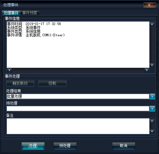 當(dāng)事件欄有未處理事件時(shí),可通過(guò)右鍵菜單【處理事件】或者雙擊要處理的事件,彈出處理事件框,如下圖: