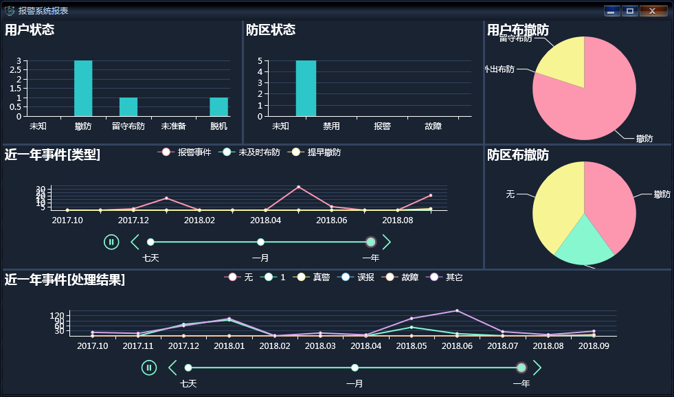 在平臺(tái)軟件中操作面板里的報(bào)表系統(tǒng)面板組上,點(diǎn)擊相應(yīng)的報(bào)表,如【報(bào)警系統(tǒng)】,將彈出相應(yīng)的報(bào)表窗口,如下圖: