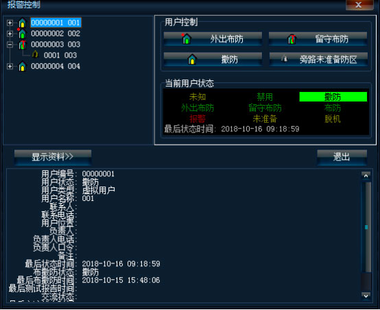 用戶列表右鍵菜單,點(diǎn)擊【撤防】、【外出布防】、【留守布防】,也可快捷的進(jìn)行用戶控制。
