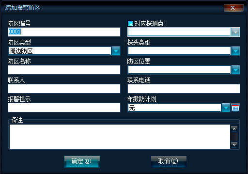 可錄入報警防區(qū)的聯(lián)系信息和探頭類型及防區(qū)備注。